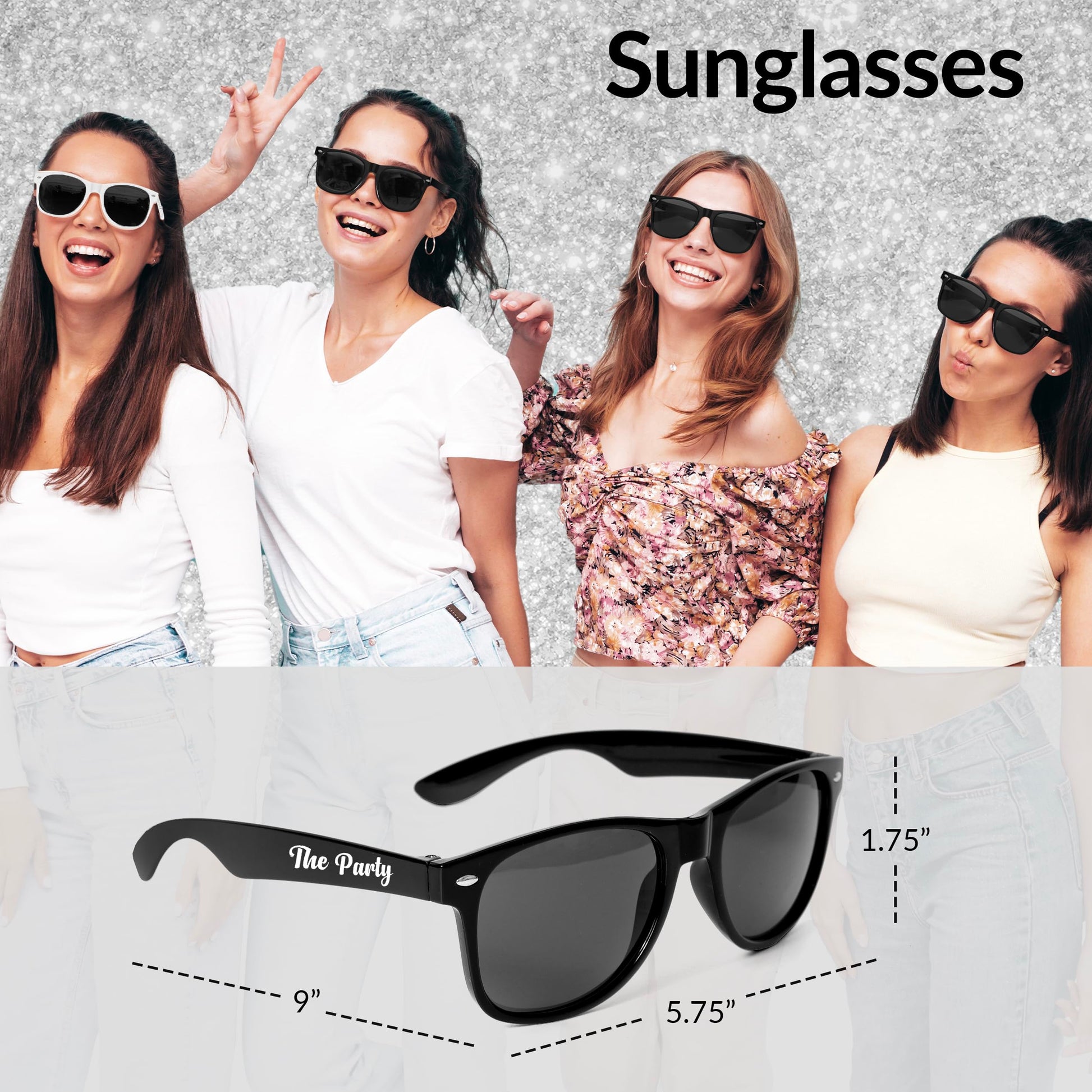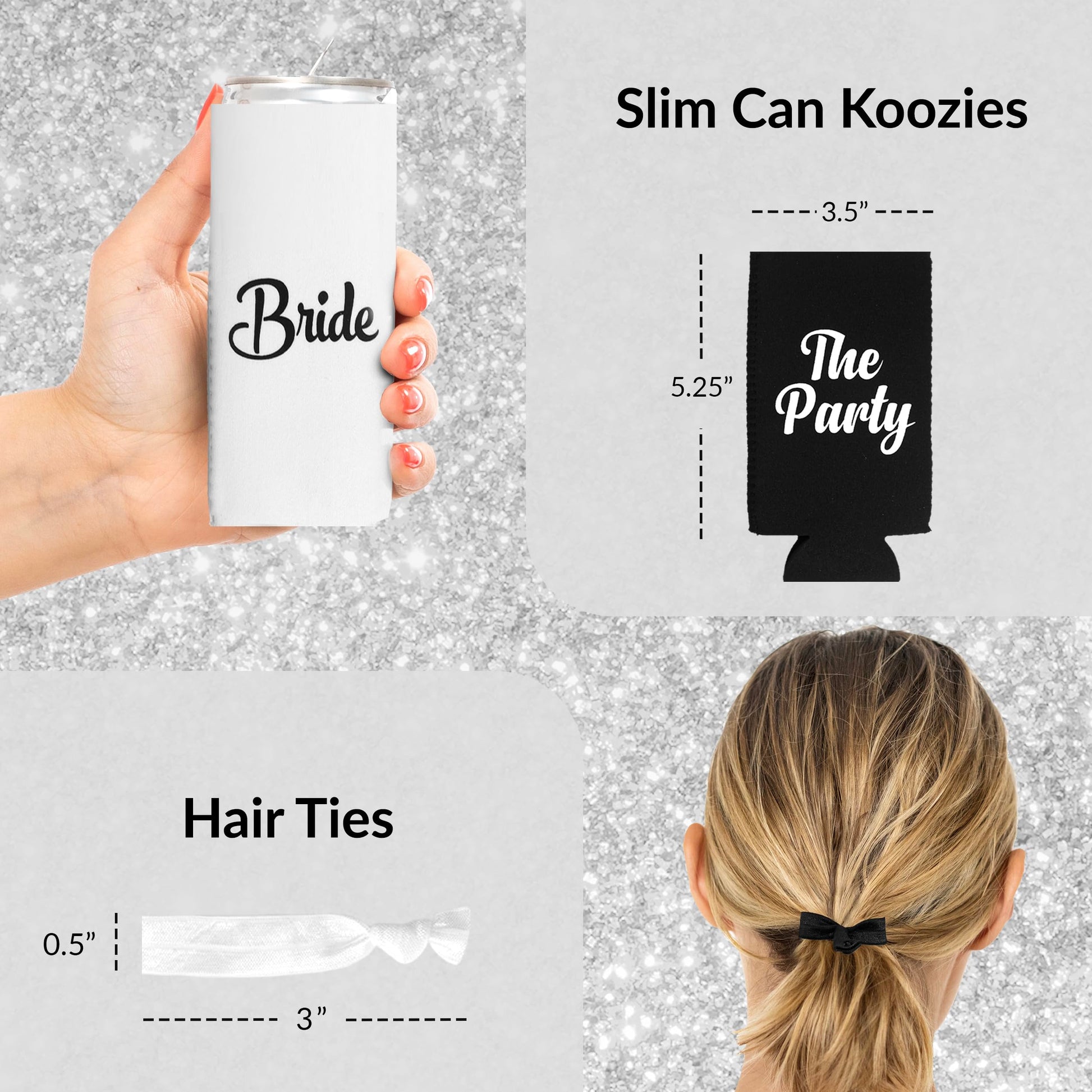 - ULTIMATE BACHELORETTE PARTY BUNDLE: Our 30 piece set comes with black bachelorette party favors for the bride’s crew and white favors for the bride. The set includes 4 black bachelorette fanny packs and 1 bride fanny pack, 4 black sunglasses and 1 white pair of sunglasses, 4 bridesmaid slim-can koozies and 1 bride slim-can koozie, 4 black hair ties and 1 white hair tie, and 10 temporary tattoos for both the bride and bridesmaids. This set creates the perfect bachelorette party kit for a fun-filled celebration!