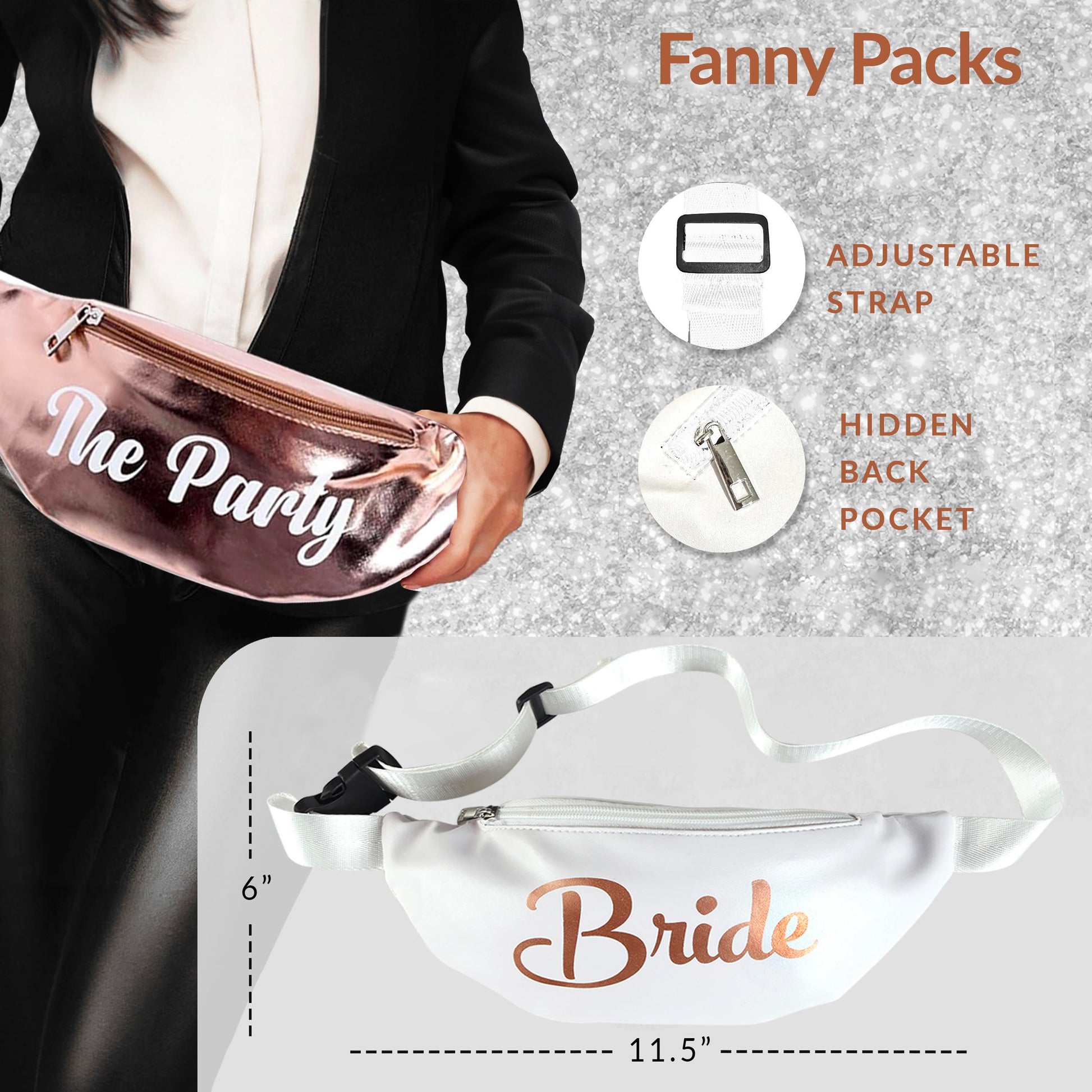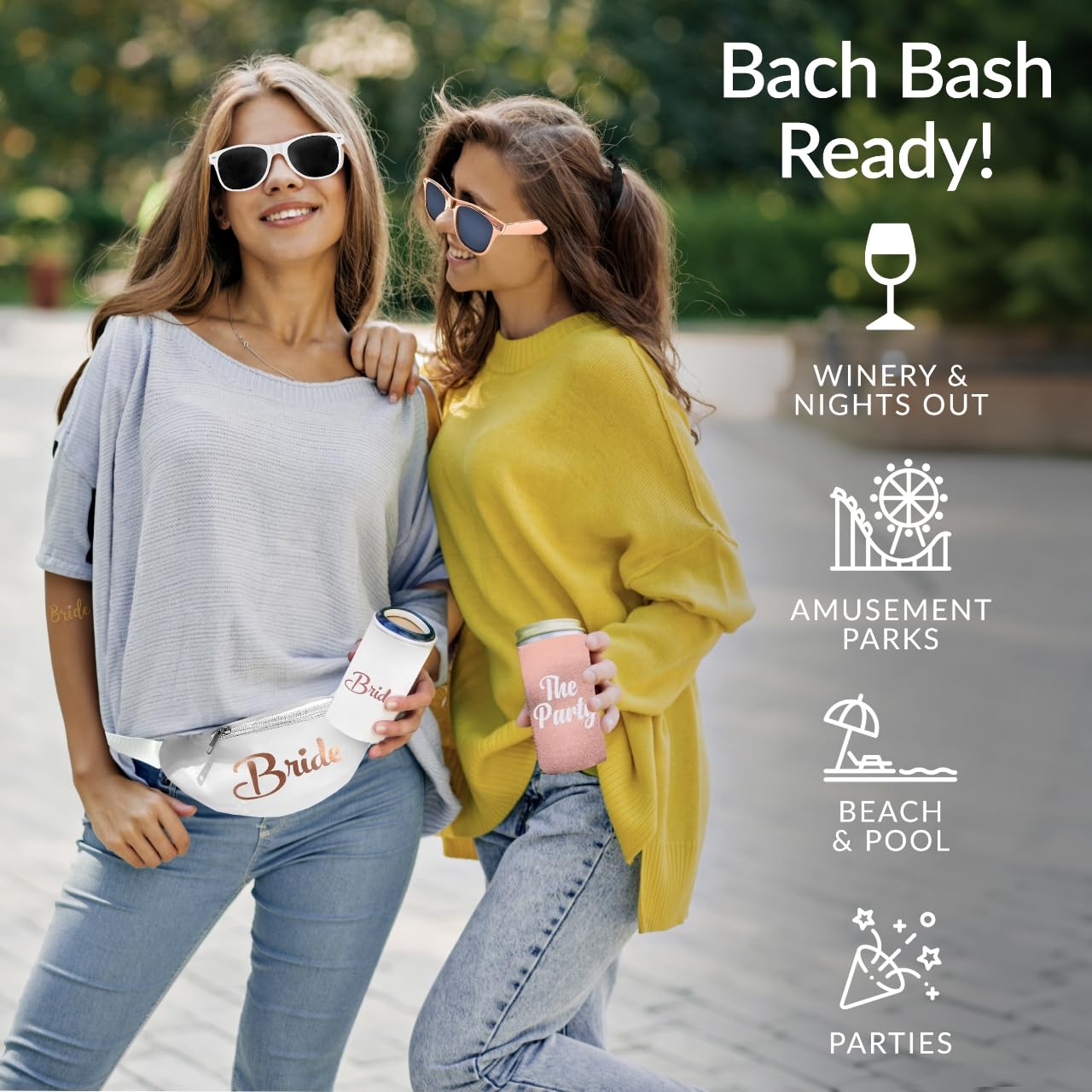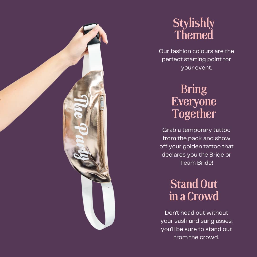 - CELEBRATE THE BRIDE-TO-BE: Every item comes with a special bride version! From rose gold bachelorette sunglasses to chic bachelorette fanny packs, the bride shines bright with her unique white bride counterparts.