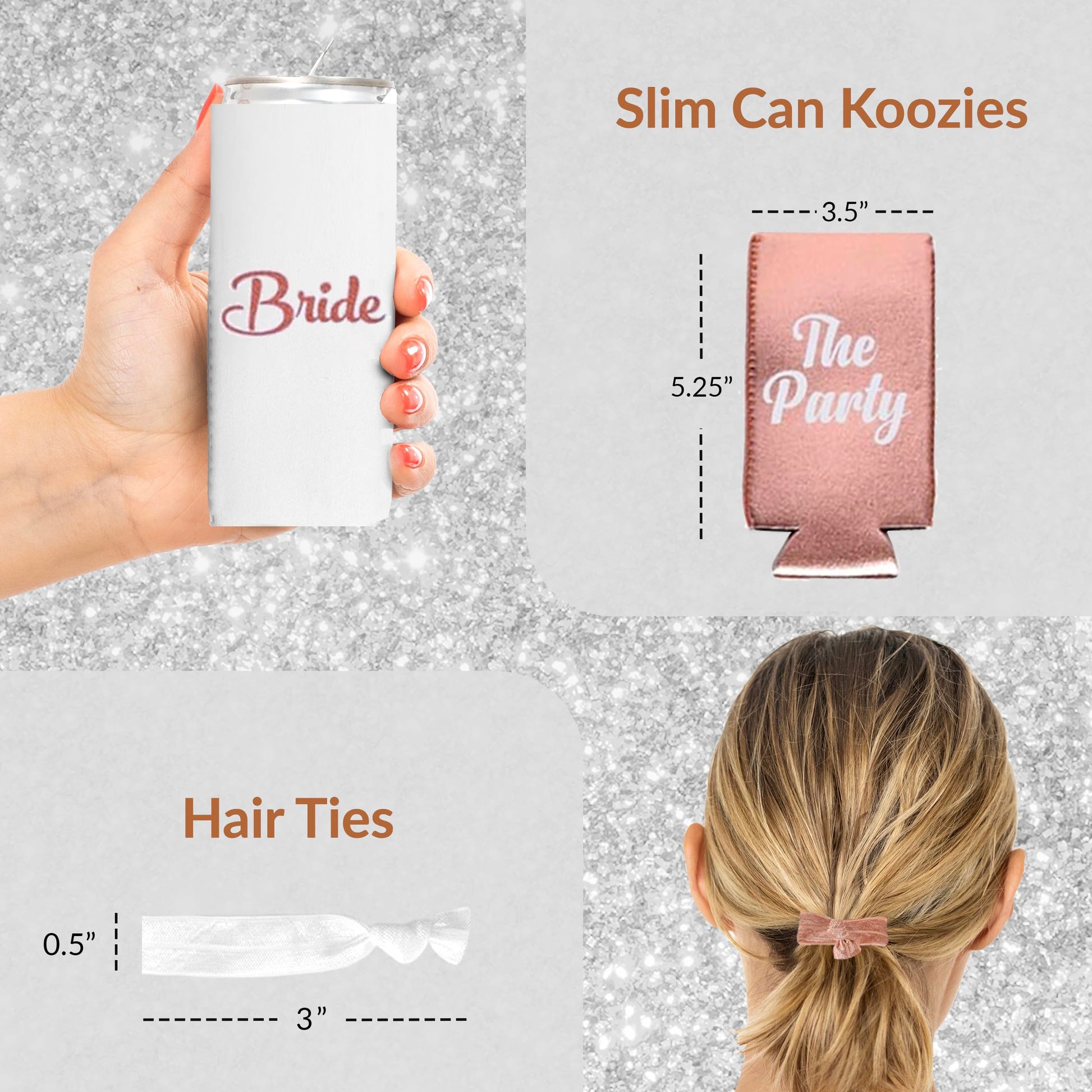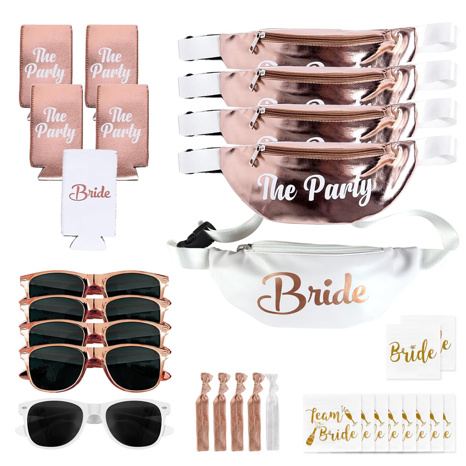 - ULTIMATE BACHELORETTE PARTY FAVORS BUNDLE: Our 30 piece set comes with rose gold bachelorette party favors for the bride’s crew and white favors for the bride. The set includes 4 bachelorette fanny packs and 1 bride fanny pack, 4 rose gold sunglasses and 1 white pair of sunglasses, 4 bridesmaids slim can koozies and 1 bride slim can koozie, 4 rose gold hair ties and 1 white hair tie, and 10 tattoos for both the bride and bridesmaids. This set creates the perfect bachelorette party kit for a fun-filled celebration!