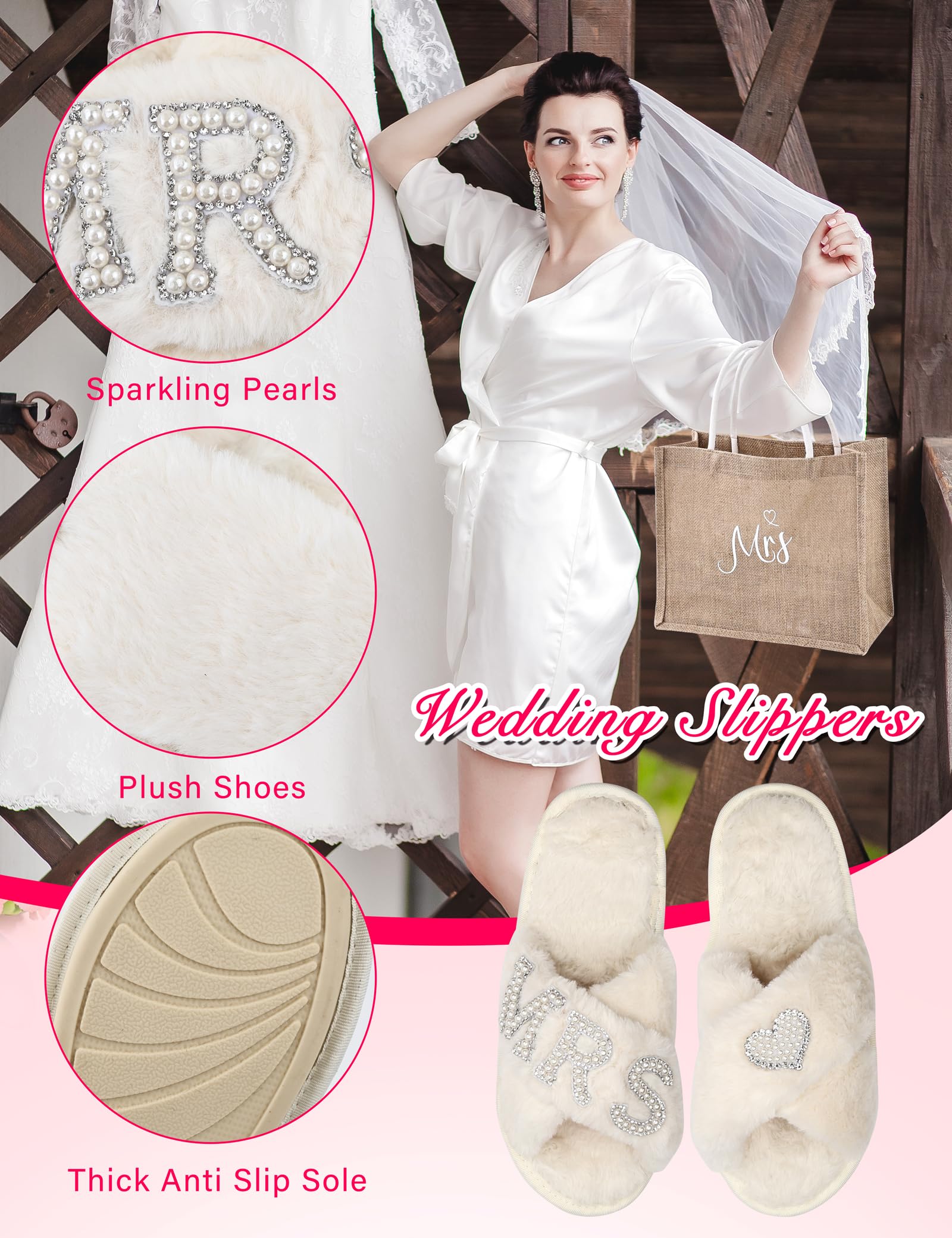 - You will receive a nice bridal wedding gifts including 1 short satin robe, 1 bride tote bag and 1 makeup bag, 1 pair of bride wedding slippers, 1 hair ring and 1 hairband