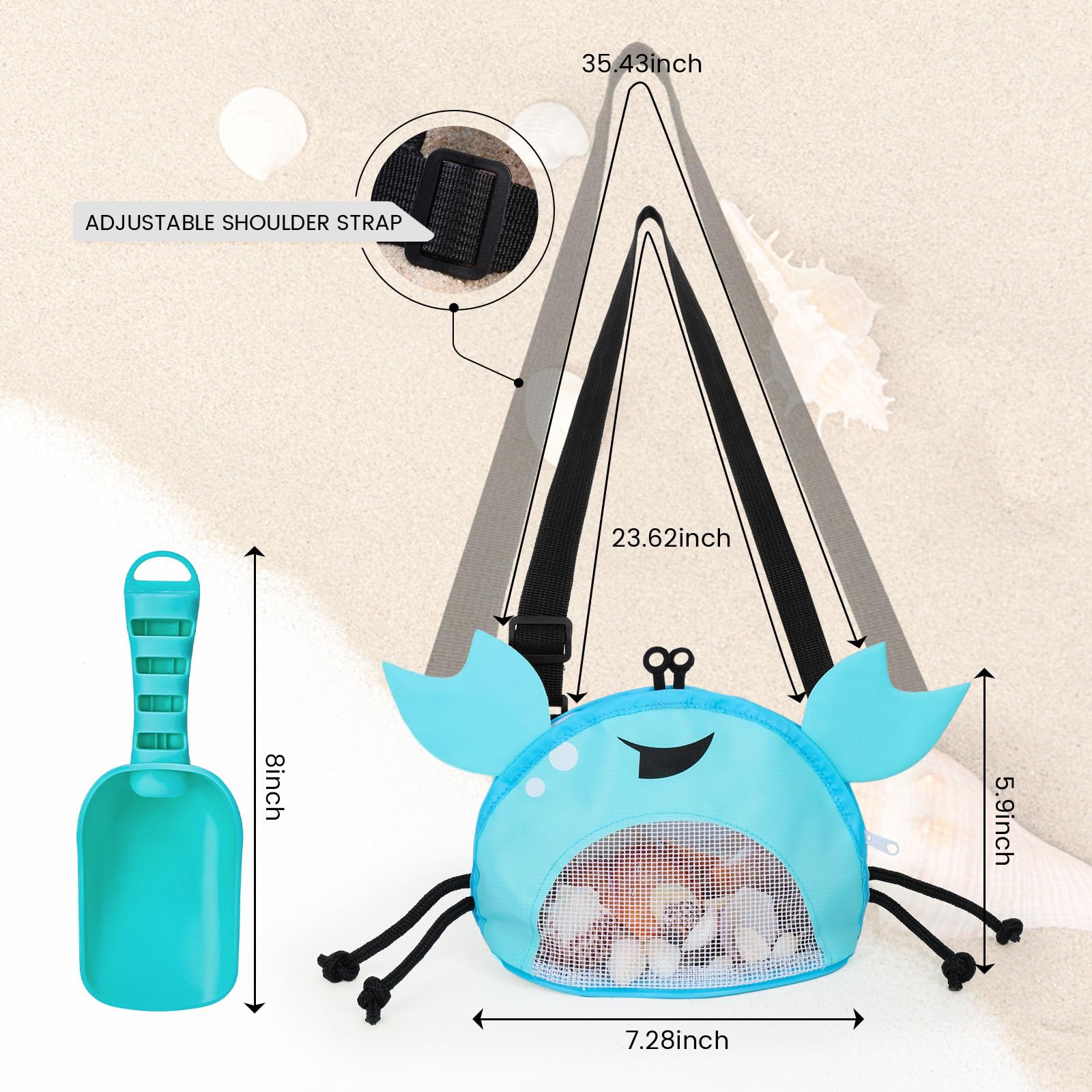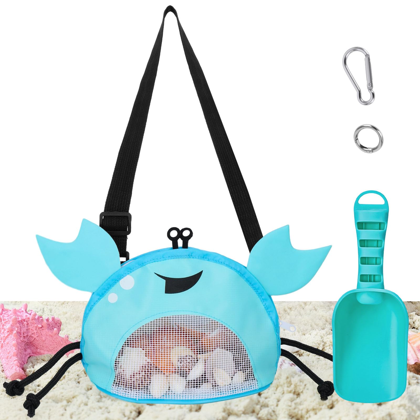 AMOR PRESENT Mesh Beach Bag for Kids, Shell Collecting Bag with Shovel Crab-Shaped Seashell Bag Adjustable Strap for Holding Shell Sea Pool Sand Toy, Blue