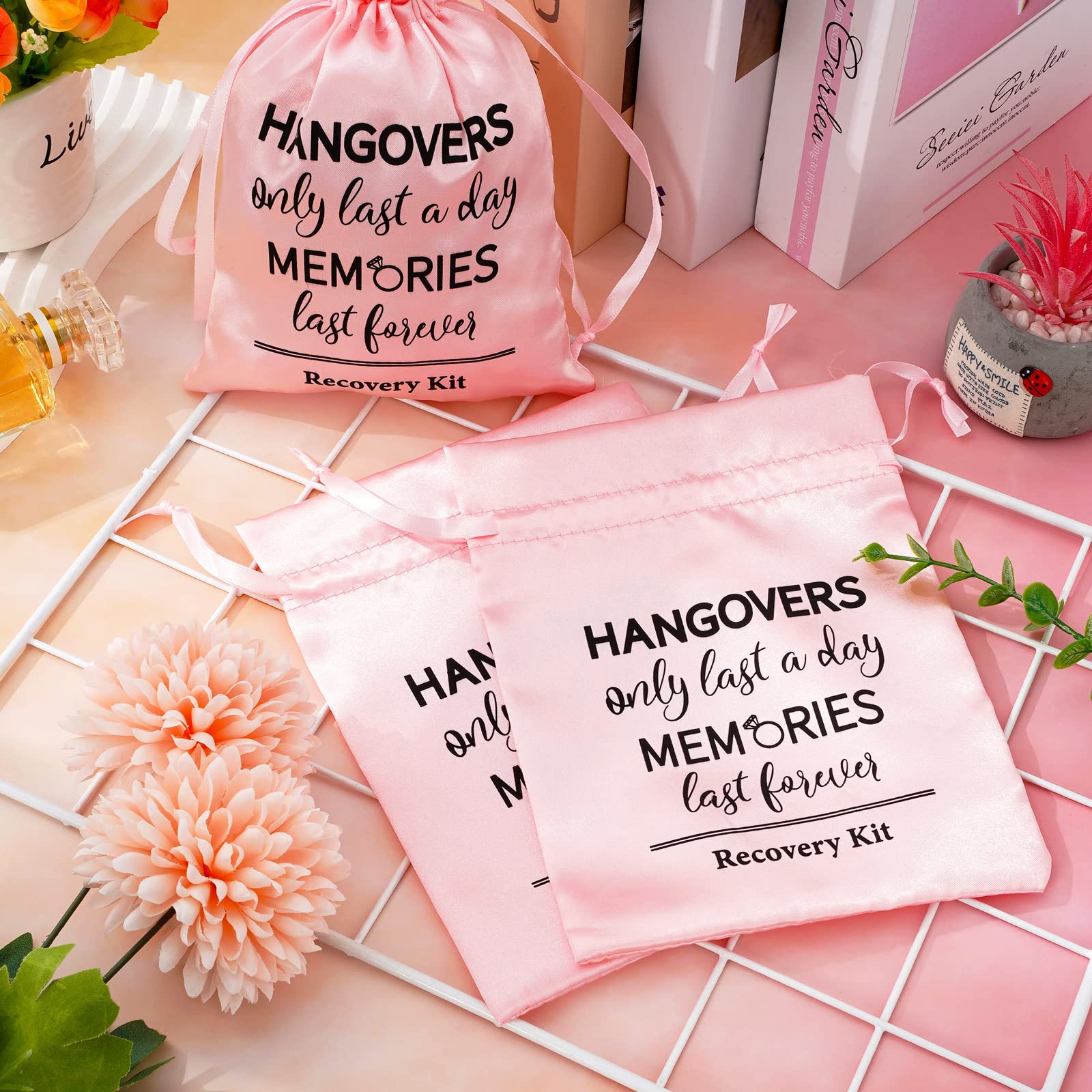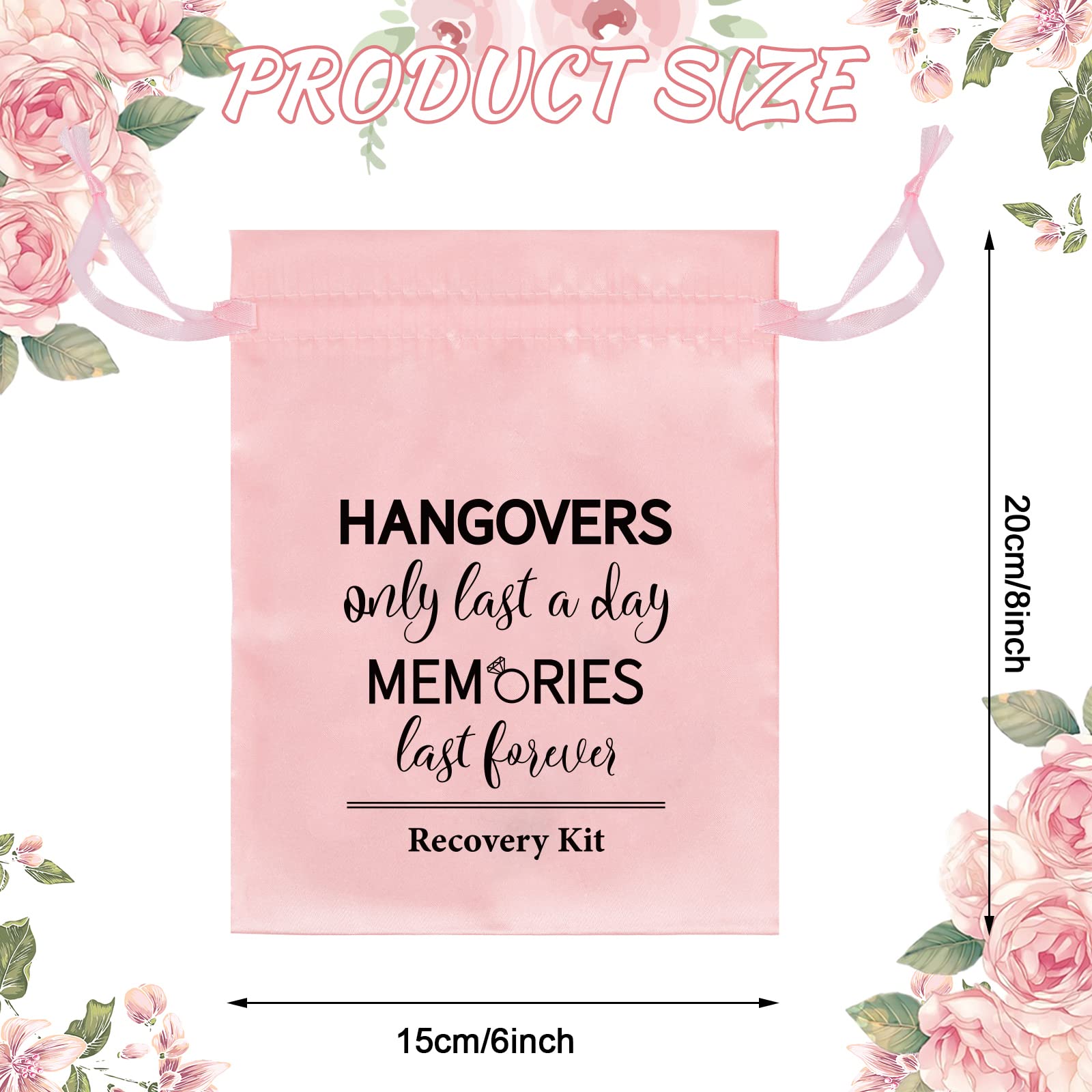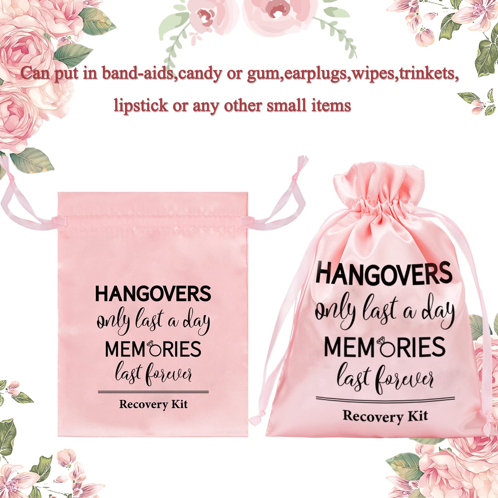- PINK BAGS: These bags are all colored in pink, unique and delicate, the bags are also printed with words, hangovers only last a day memories last forever, recovery kit and there are ropes on both sides of bags, easy to close and open.