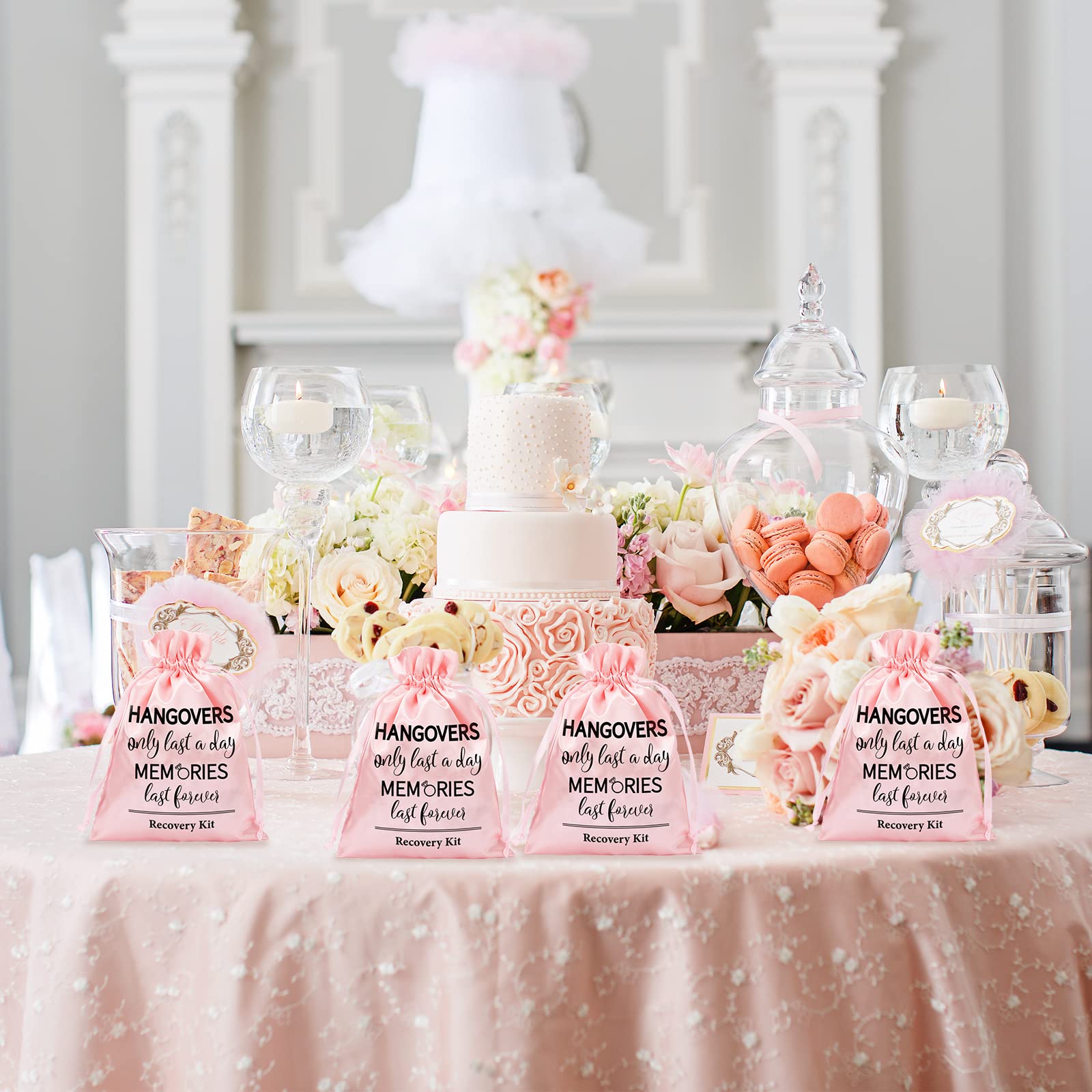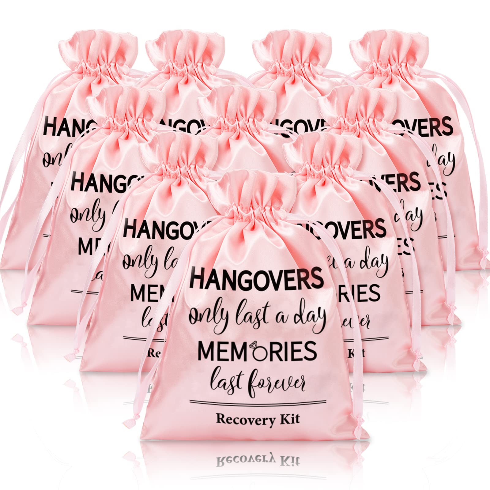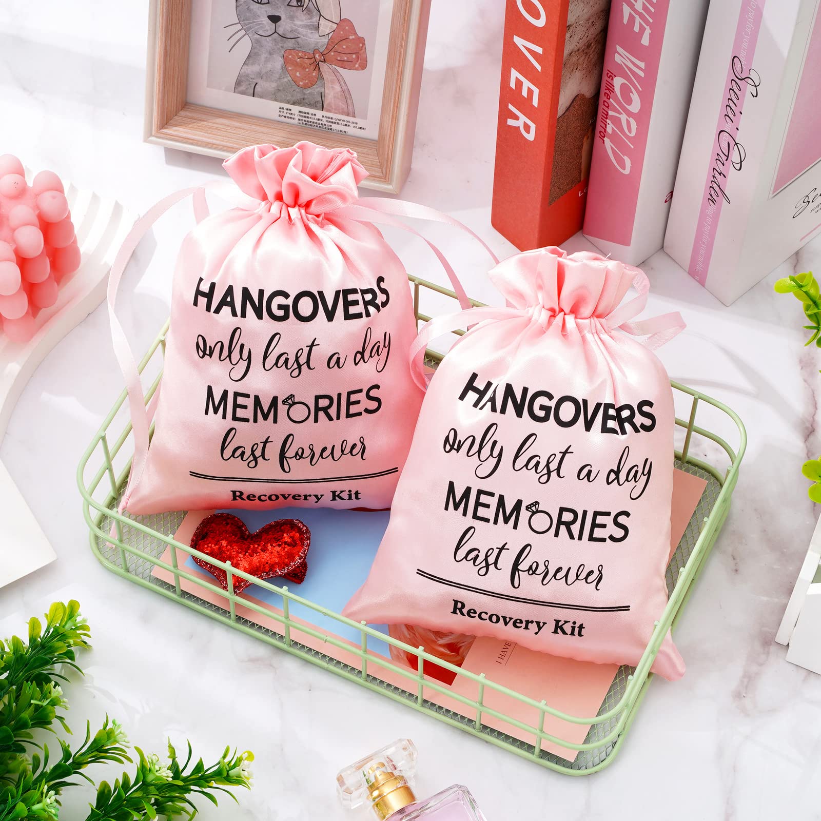 - PINK BAGS: These bags are all colored in pink, unique and delicate, the bags are also printed with words, hangovers only last a day memories last forever, recovery kit and there are ropes on both sides of bags, easy to close and open.