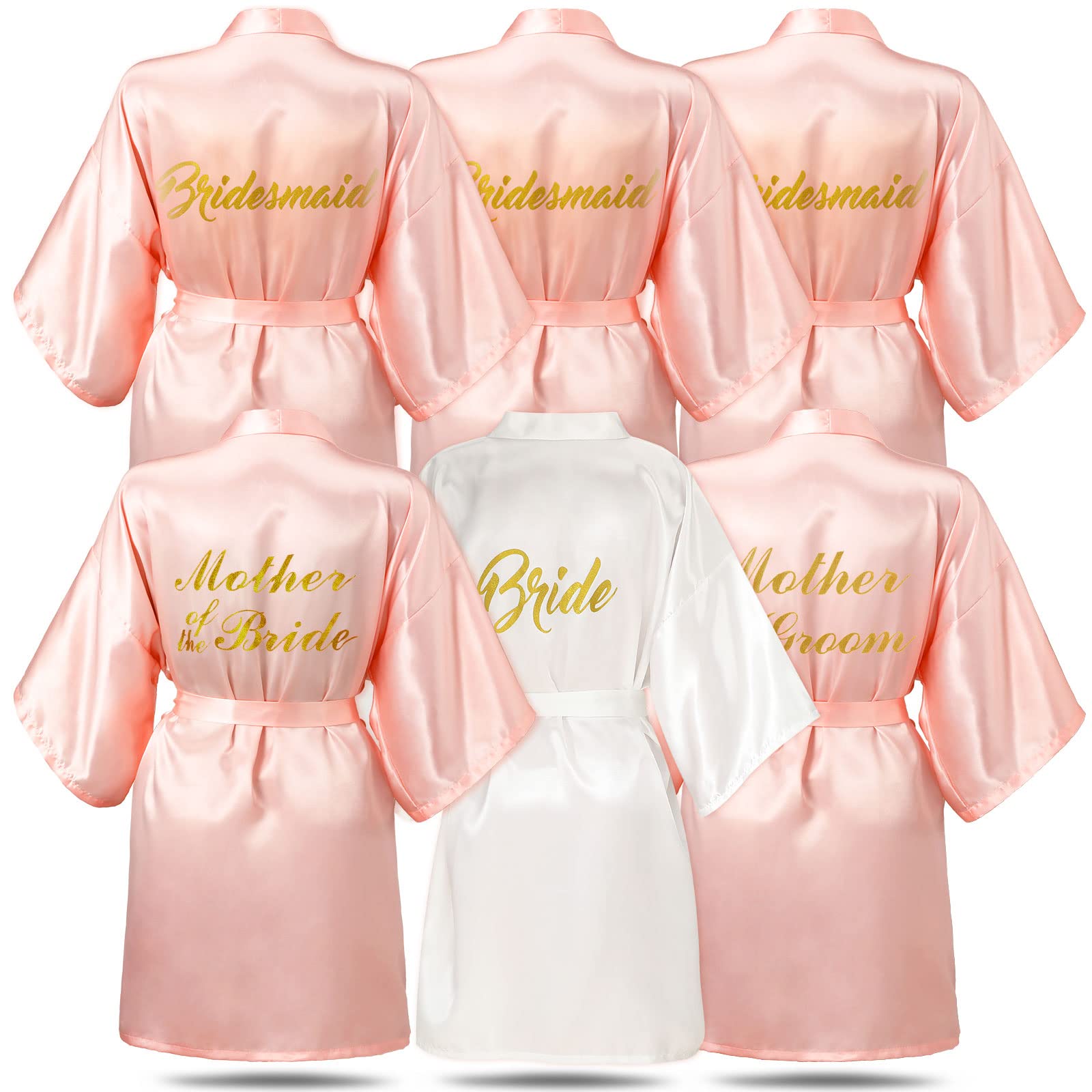 - Bridal Party Satin Robes: the package includes 1 piece of white bride robe, 3 pieces of pink bridesmaid robes, 1 piece of mother of the bride robe, and 1 piece of mother of the groom robe, measuring about 34.7 inches long, soft satin sleepwear for bride and bridesmaid, suitable for bridal shower, wedding shower, bachelorette party,bridesmaid night party, bridal party, sleeping, bathing, and lounging, let you shine any time