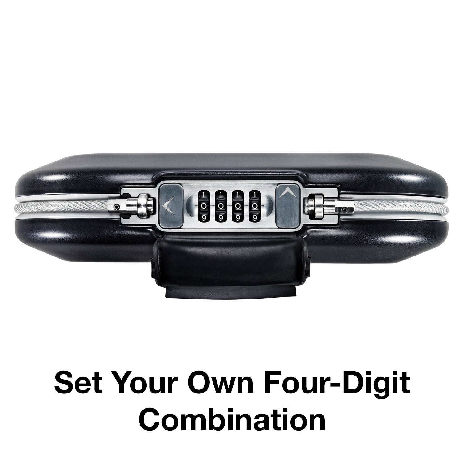 Details: The Master Lock 5900D Set Your Own Combination Portable Personal Safe features durable construction made to withstand abuse and is water resistant. The safe measures 2-1/5in (57mm) H x 9-2/5in (23.9cm) W x 5-1/10in (13.1cm) D; and is ideal for recreation, campus, office, travel or leisure use. The safe includes a cable to wrap securely around a fixed object or use as a carrying handle. The Limited Lifetime Warranty provides peace of mind from a brand you know and can trust.