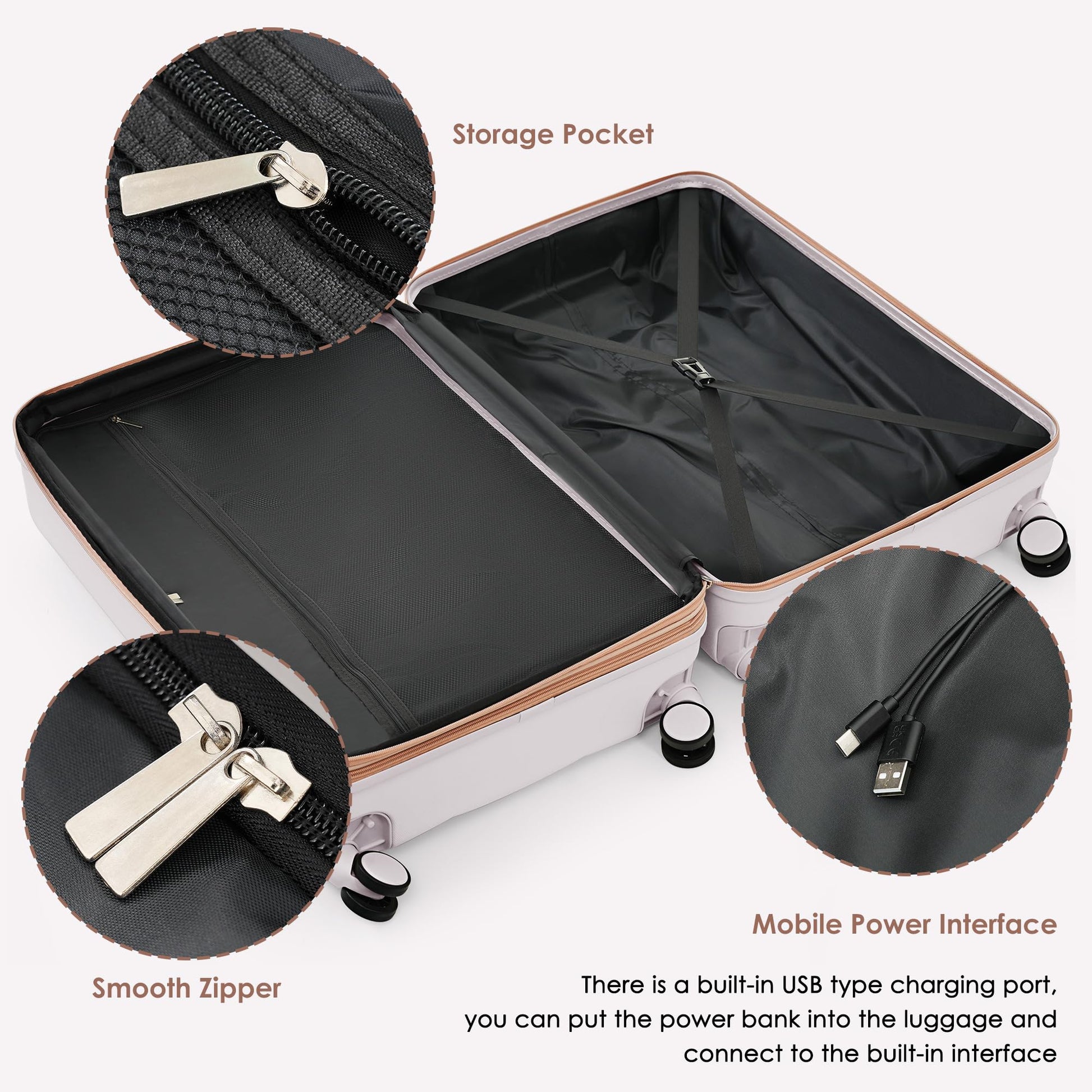Weight (lbs.):26.46 【High Quality Luggage Sets】Made from extra strong ABS material, which is lightweight and extremely durable. Features textured finish to prevent against scratches,keeping lightweight luggage set beautiful trip after trip. 【3 Piece Luggage set】The 20" carry on suitcase features USB charging ports (Power bank not included), 24", 28 "are expandable, adding 25% space capacity for hardshell luggage. 【Easy Maneuvering】 4 360-degree rotating wheels make this suitcase as mobile as they get. Regardless of direction, these wheels allow your suitcase to stay upright while getting pushed, pulled and dragged in any direction. 【Side hooks】 Side hooks to reduce the burden on hands. 【Handy Packing】 Includes a spacious, highly functional interior with mesh pockets and elastic tie-down straps. Pack neatly and securely. 【Free Your Hands】 The newly designed cup holder is perfectly integrated into the structure of the spinner luggage, providing you with a convenient option to put your cup on the go without worrying about it tipping or slipping.