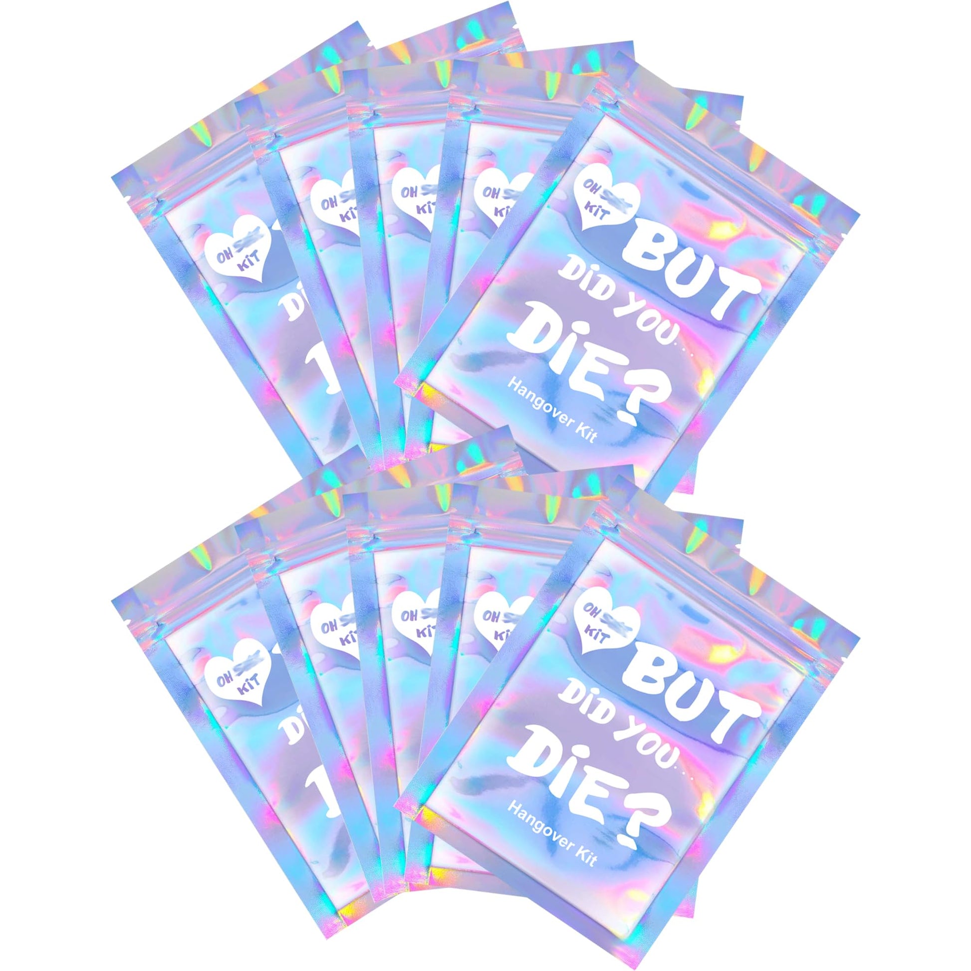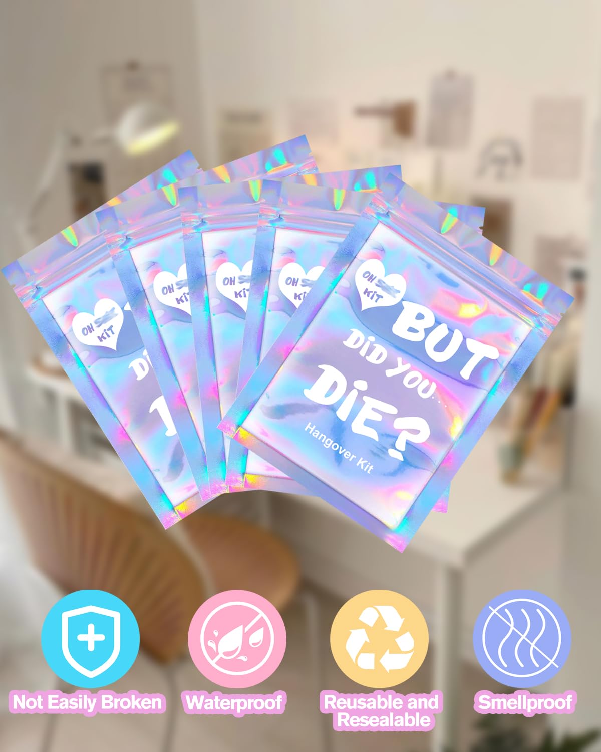 - HANGOVER KIT BAGS: 20/50 pack 5”x7” inch empty hangover bags with a beautiful laser appearance printed with "BUT DID YOU DIE?", perfect size and stylish appearance for your party needs.