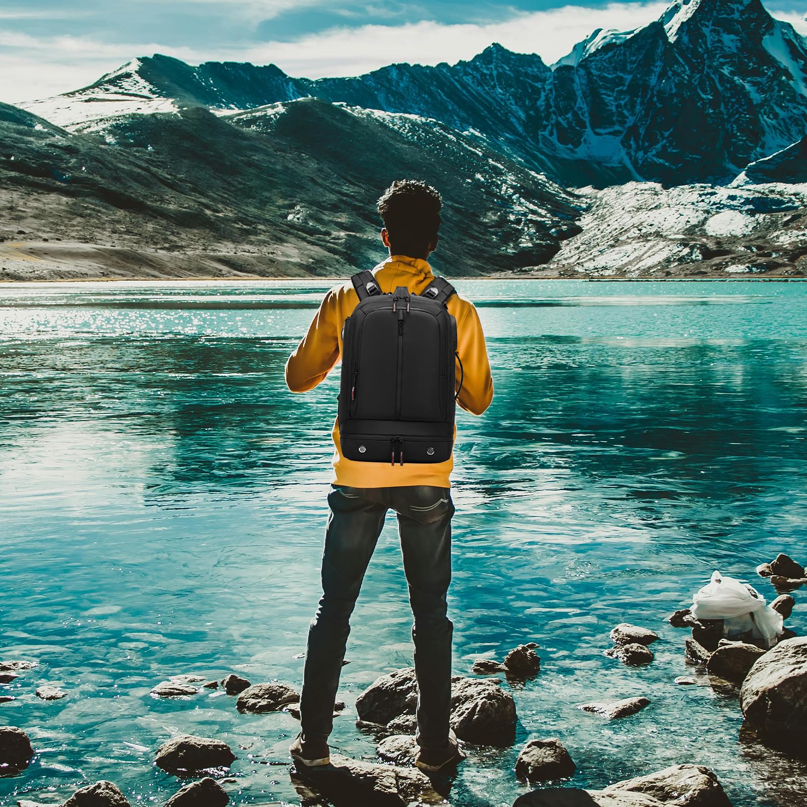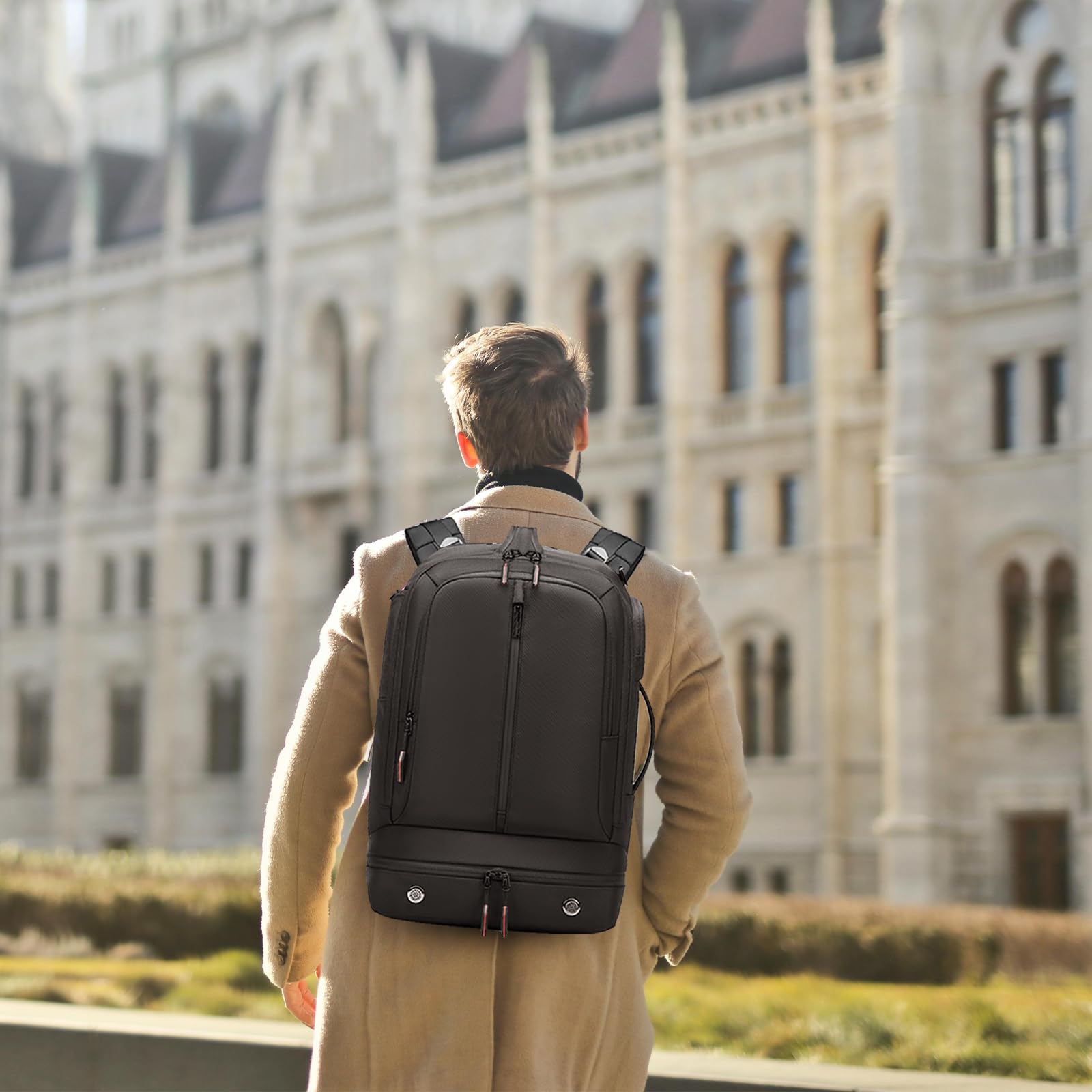 - 【3 Large Compartments】: This large travel backpack offers 3 main spaces. The front compartment with transparent pockets, The middle main large compartment equips a dry and wet separation area, which has a zipper and can store wet items, and a garment restraint strap, which can fix items for reduced movement. The back computer compartment can accommodate a 16-inch laptop and is designed with a hickened back plate to make the computer compartment more comfortable.