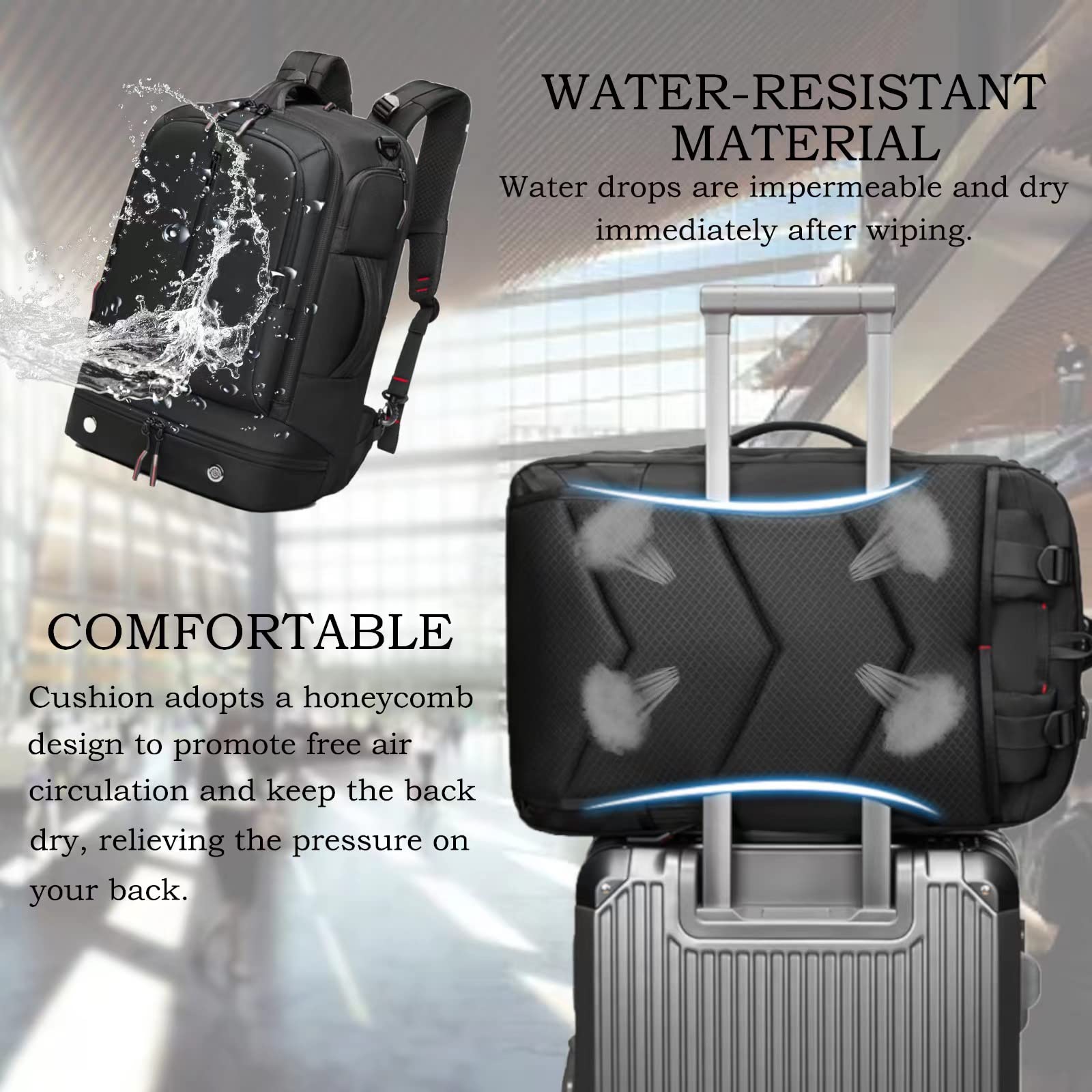 - 【Multiple Ways to Facilitate Carrying】:The backpack has 3 modes of carrying, including double shoulder, single shoulder, and portable. And its cushion adopts a honeycomb design to promote free air circulation and keep the back dry, relieving the pressure on your back. In addition, this backpack comes with a trolley case fixing belt, and its shoulder strap can be hidden in the back storage bag simply by removing the shoulder strap hook.
