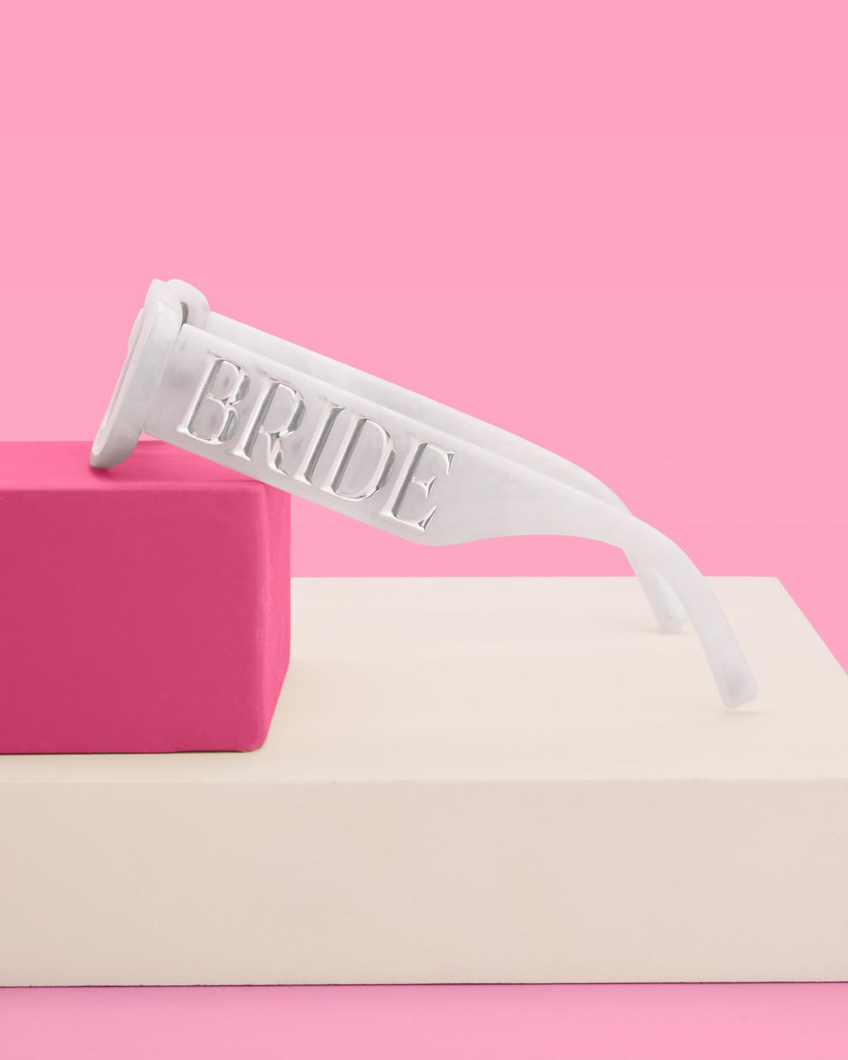 - Bride to Be: These statement sunnies are designed to be party ready with a white marble frame and silver "Bride" logo on each temple side.